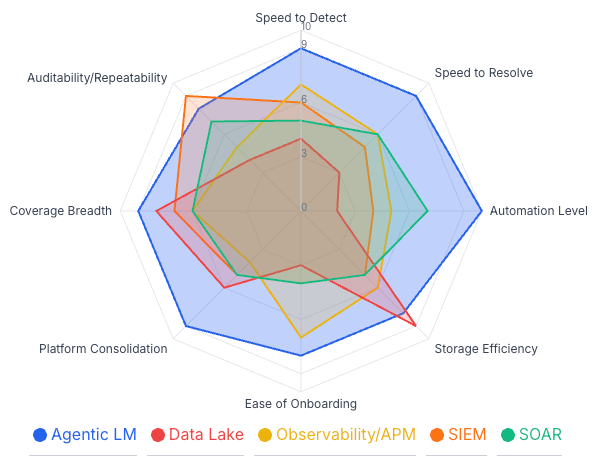 From collecting and visualizing logs to orchestrating outcomes with specialized AI agents. Here's how agentic teams compare to SIEM, Observability/APM, Data Lakes, and SOAR.